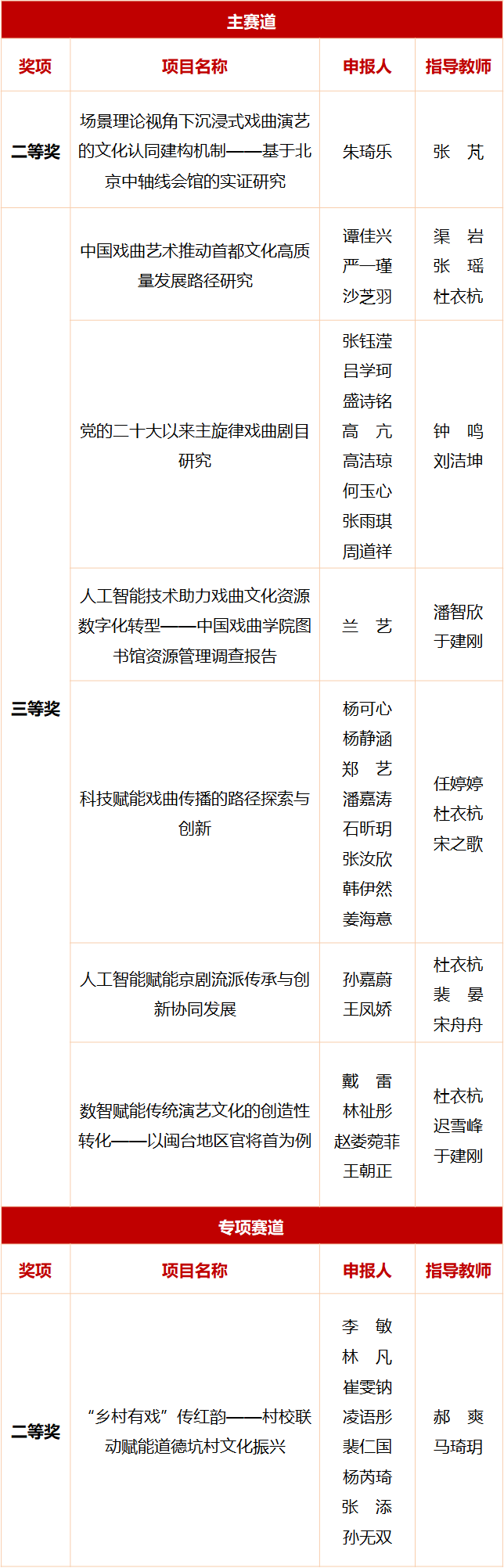 在学校党委的坚强领导下,我校按照有关要求积极组织学生参赛。经个人申报,系部推荐,校学工部、团委研究审议通过,共推荐7个作品参加主赛道比赛,3个作品参加专项赛道比赛。学校始终坚持以习近平总书记重要回信精神为根本遵循,全面落实北京市第十三次党代会和共青团北京市第十五次代表大会精神,突出就业创业育人实效,深化产学研合作,为培养更多具有创新精神和实践能力的戏曲艺术人才不懈奋斗。