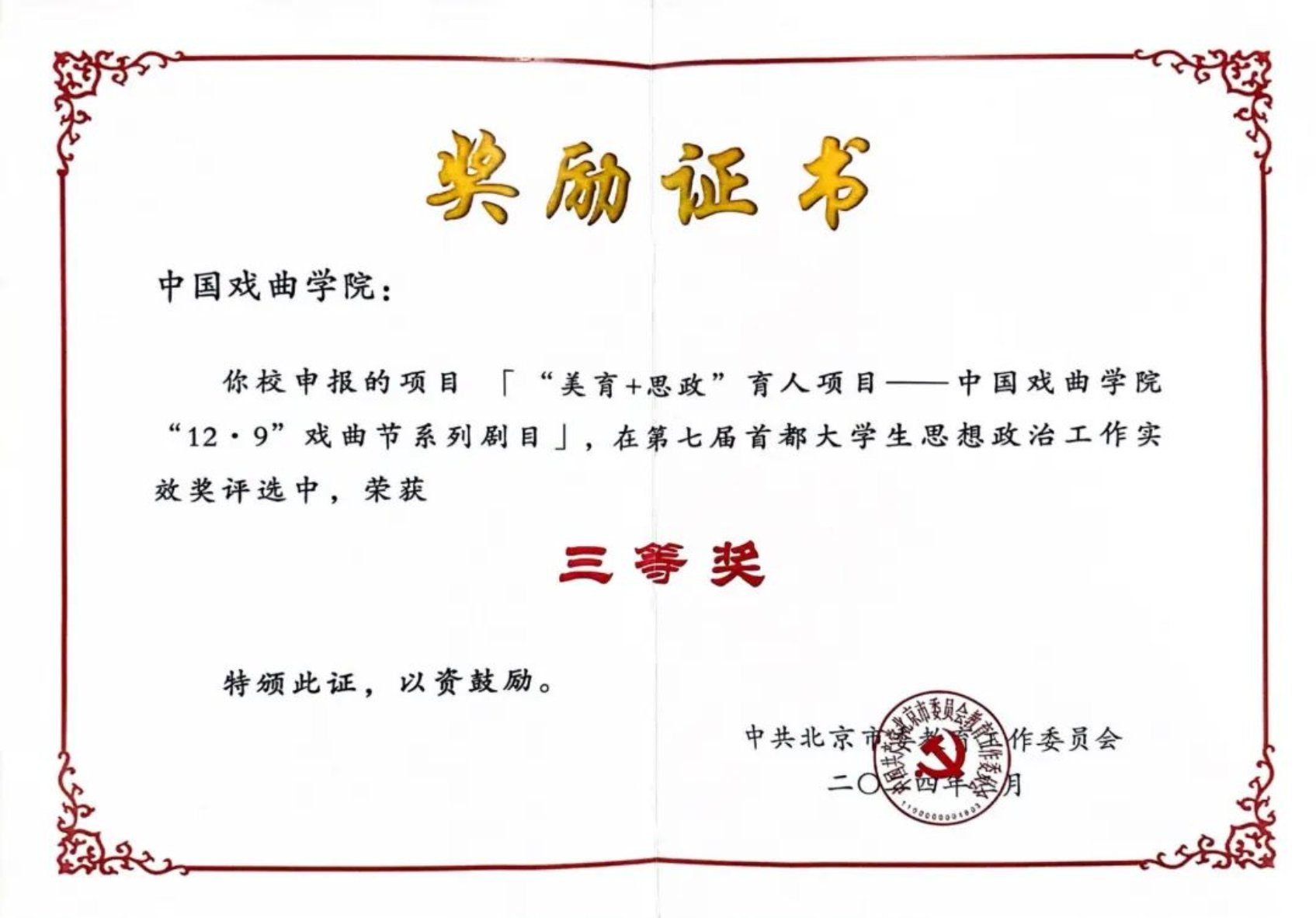 日前,在市委教育工委组织开展的第七届首都大学生思想政治工作实效奖评选中,学校“美育+思政”育人项目——中国戏曲学院“12·9”戏曲节系列剧目荣获三等奖。