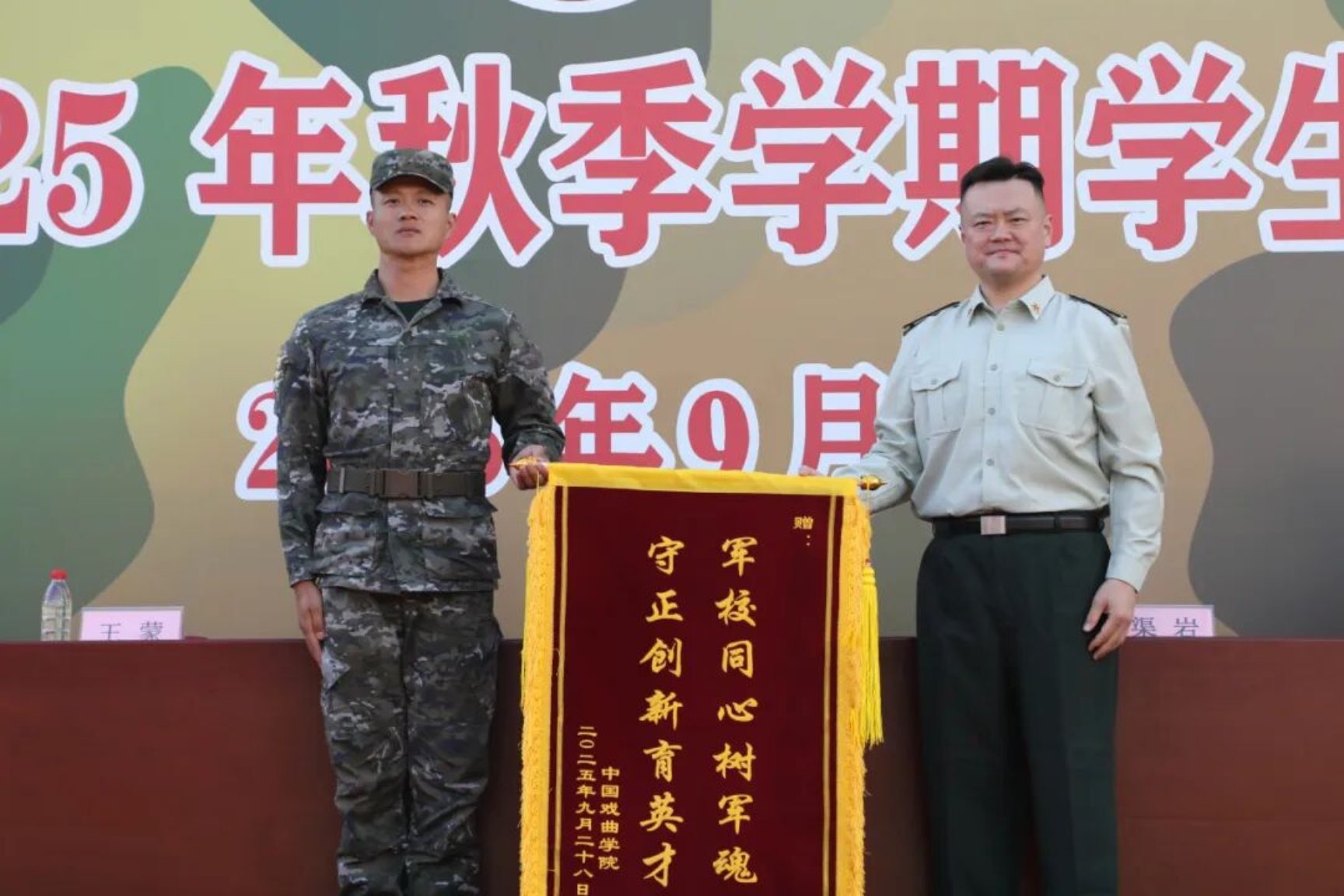 韩骏伟对同学们顺利完成军训任务表示祝贺,对施训官兵和组织保障人员表示感谢。他勉励同学们,一要锤炼坚毅品格,把军训中磨砺的吃苦精神、自律意识,转化为面对困难不退缩、迎接挑战敢担当的内在力量;二要厚植文化自信,将军训培育的集体荣誉感与戏曲人的文化使命感结合起来,深入理解中华优秀传统文化的时代价值;三要践行从艺初心,以军训锻造的过硬作风深耕专业技艺,用“台下十年功”的坚守传承戏曲薪火,为文化强国建设注入青春动能。