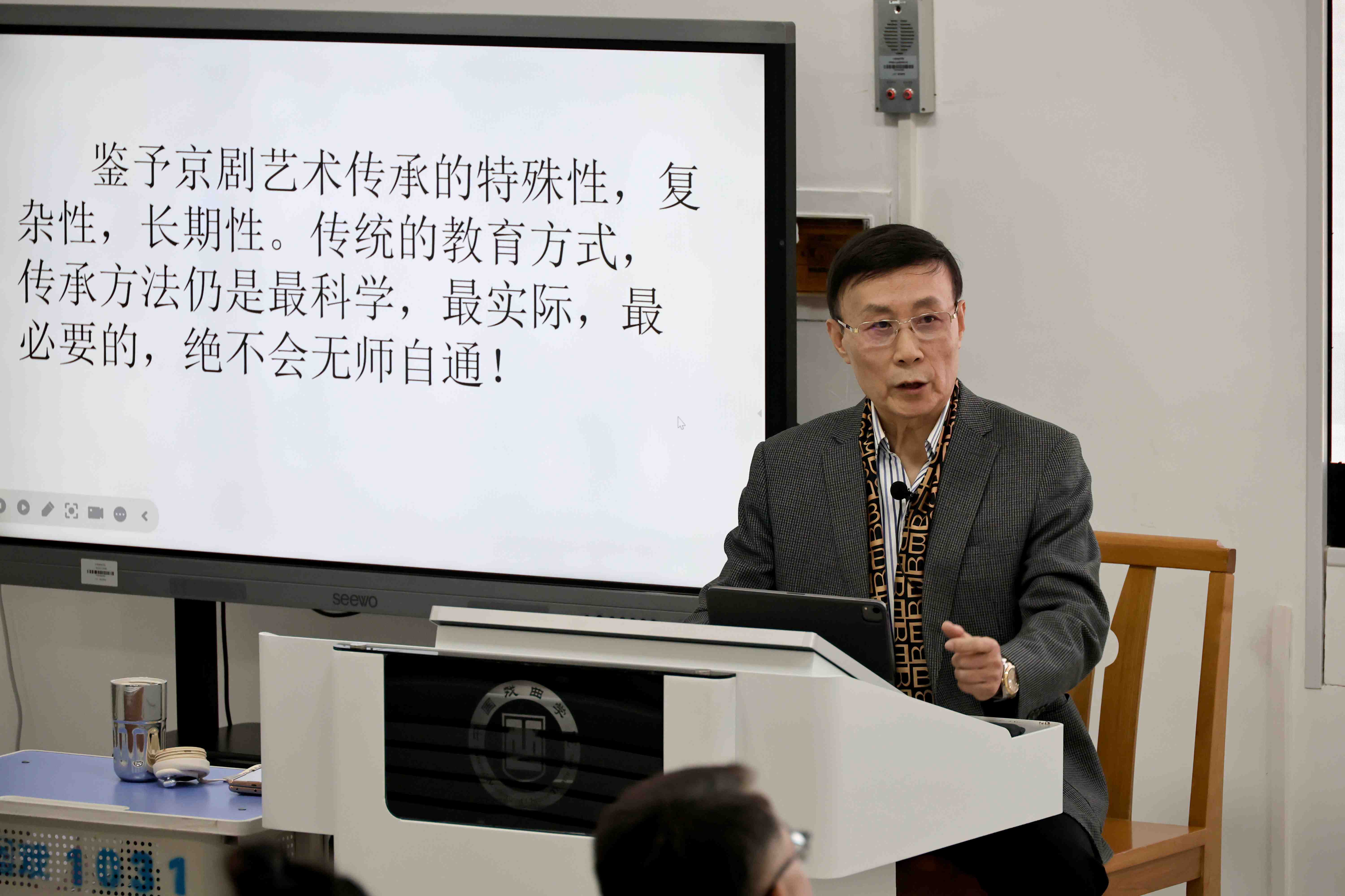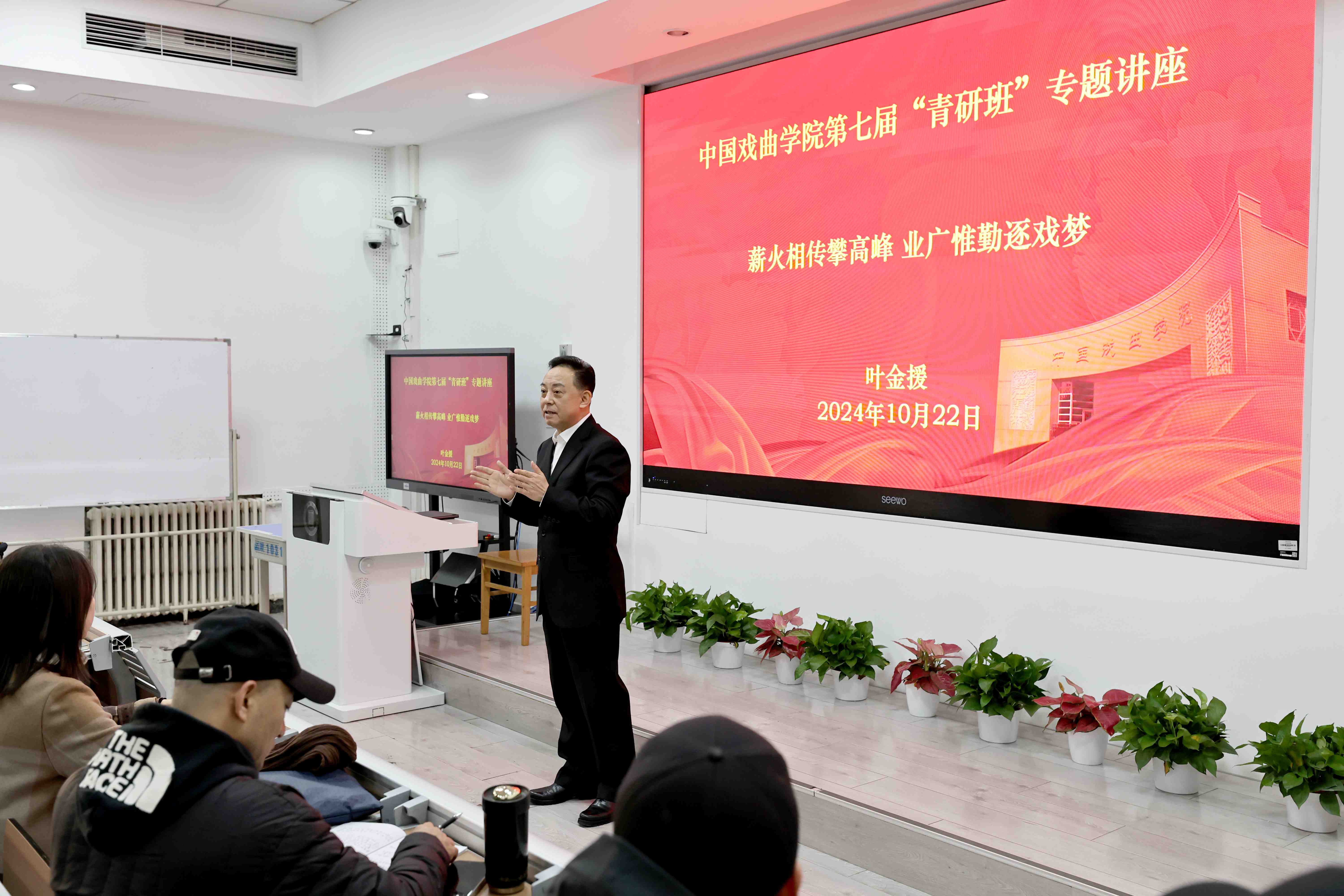 叶金援是北京京剧院国家一级演员,中国戏曲学院客座教授、第七届“青研班”导师,曾荣获中国戏剧梅花奖、梅兰芳金奖等荣誉。叶老师结合六十余年的实践经验和与多位前辈艺术家的学艺经历,向同学们分析了师承与基础的重要性、学艺的求精与执着、从艺道路上的客观与进取等问题,在从艺道路上一定要根据自身专业条件,清醒客观地去选择师承,切忌好高骛远、走捷径,做到得意而不忘形、失意而不丧志,对待艺术始终保持谦虚谨慎、精益求精的良好作风。