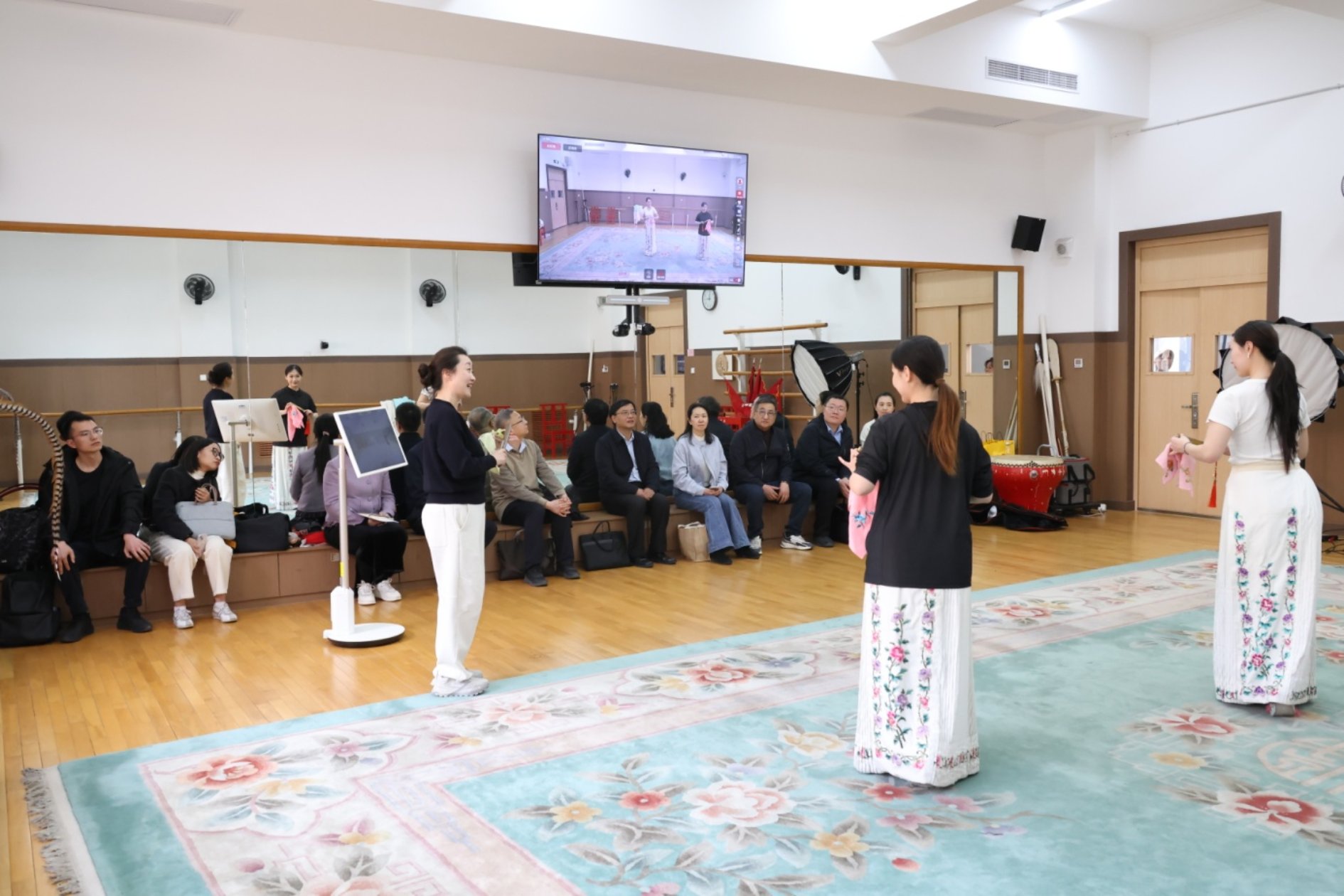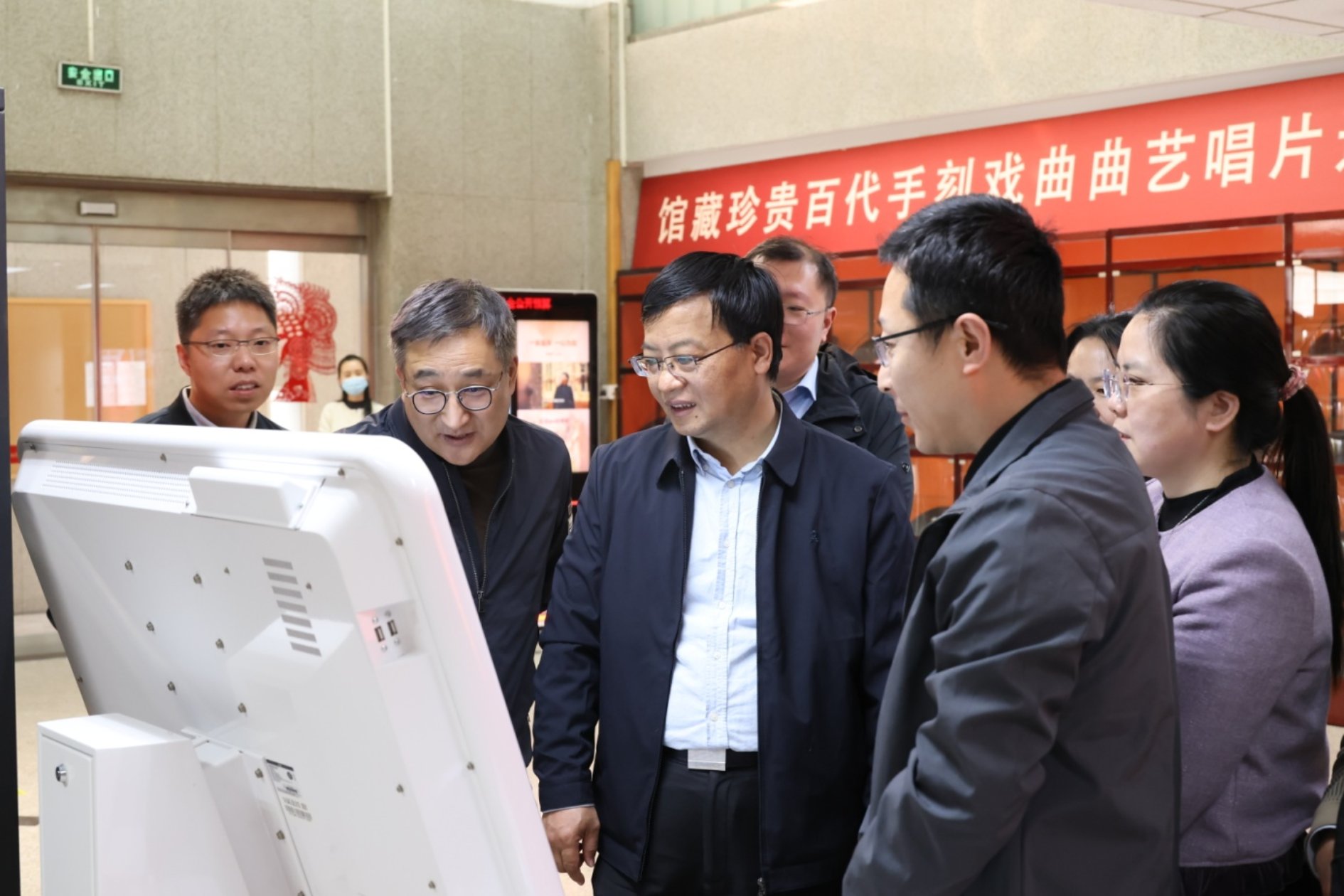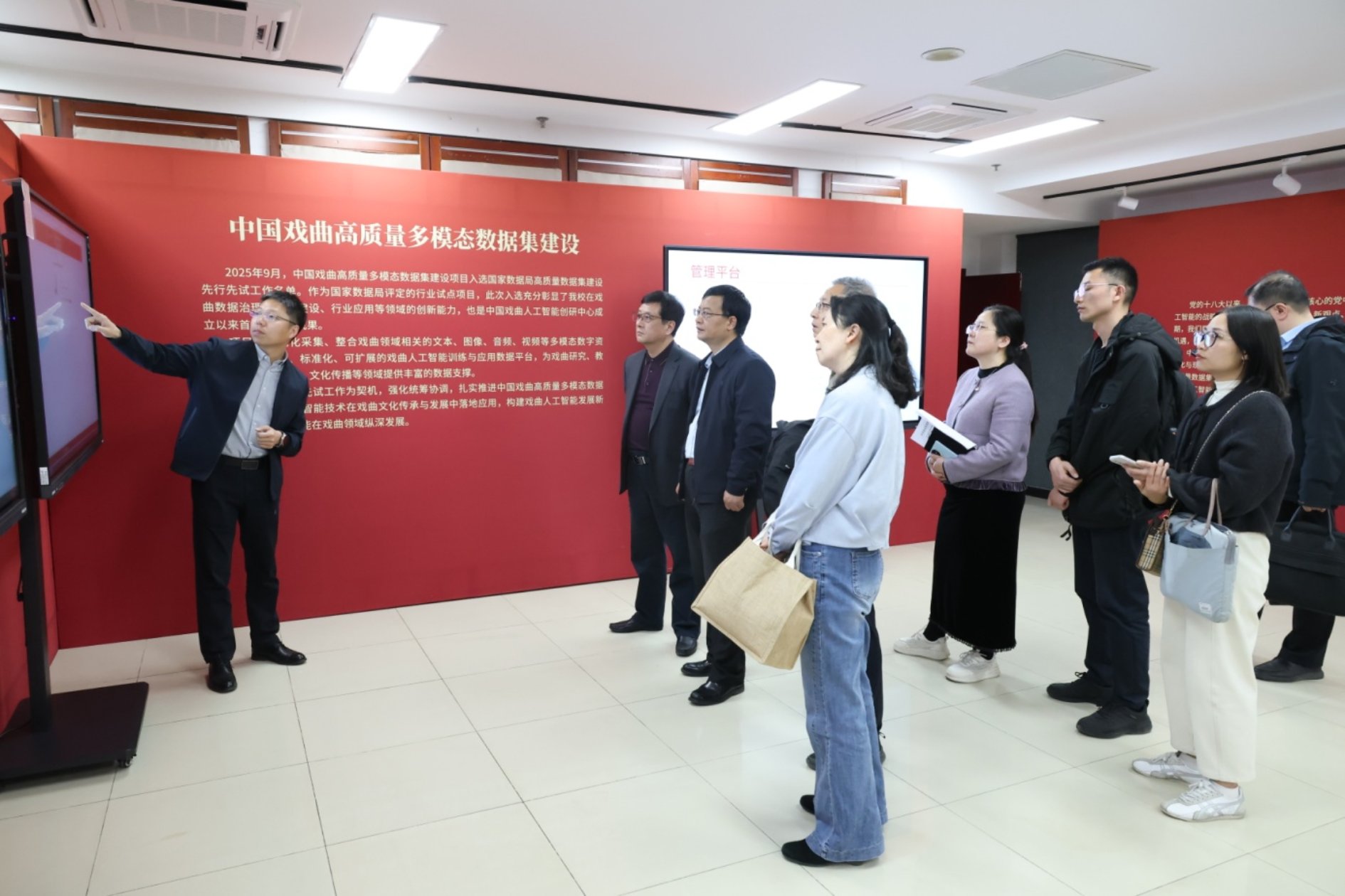 会前,陈胜利一行现场观摩了人工智能在戏曲课堂中的实际应用,参观了学校珍贵手刻戏曲曲艺唱片选展和戏曲人工智能创研成果展。